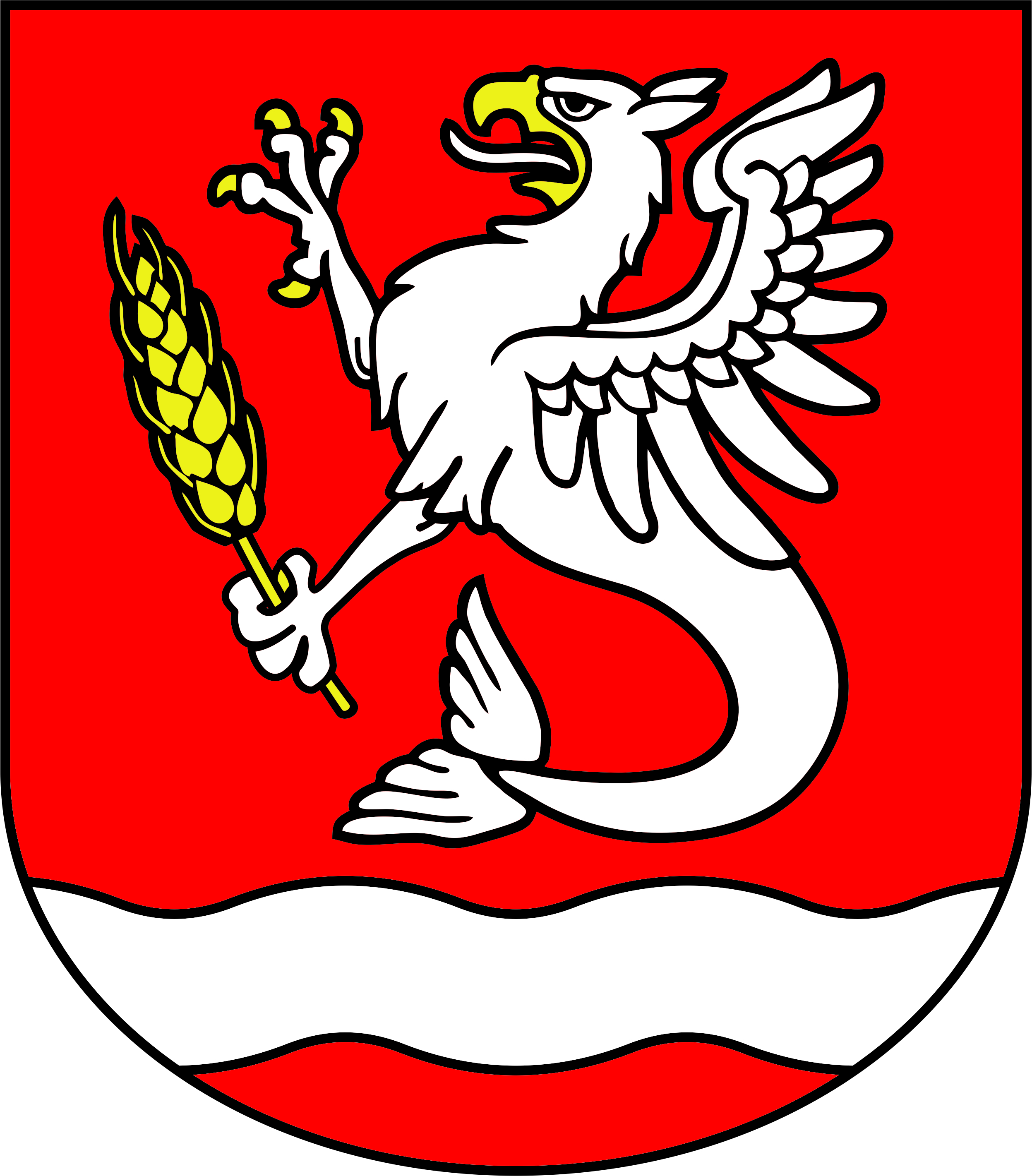 W dolnej części herbu znajduje się srebrna wstęga symbolizująca przepływającą przez teren Gminy rzekę Wieprzę, która w historii tego obszaru odgrywała niebagatelną rolę - zaopatrywała mieszkańców w ryby, stanowiła dogodną drogę wodną prowadzącą do portu w Darłowie.