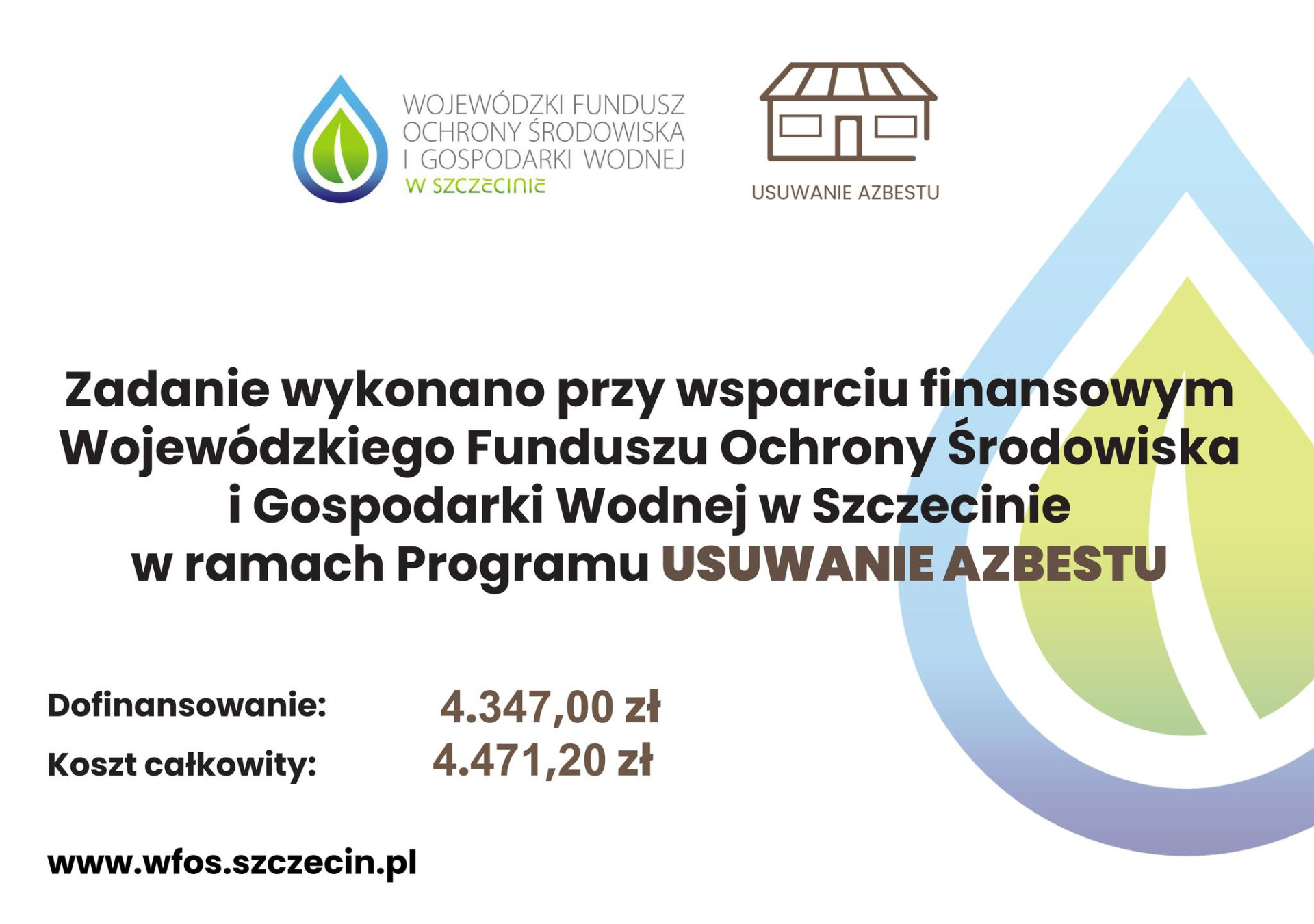 Dzięki wsparciu z Wojewódzkiego Funduszu Ochrony Środowiska i Gospodarki Wodnej w Szczecinie z terenu dwóch gospodarstw rolnych znajdujących się na obszarze naszej gminy został odebrany i zutylizowany szkodliwy azbest.