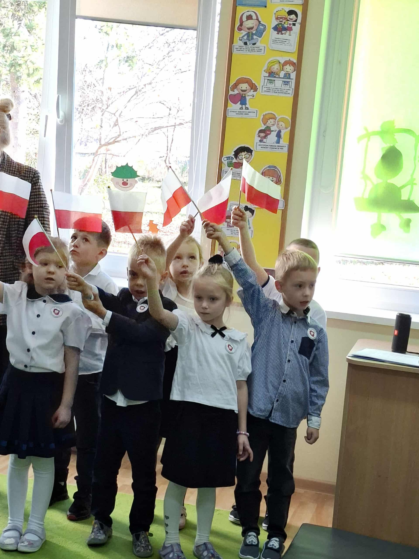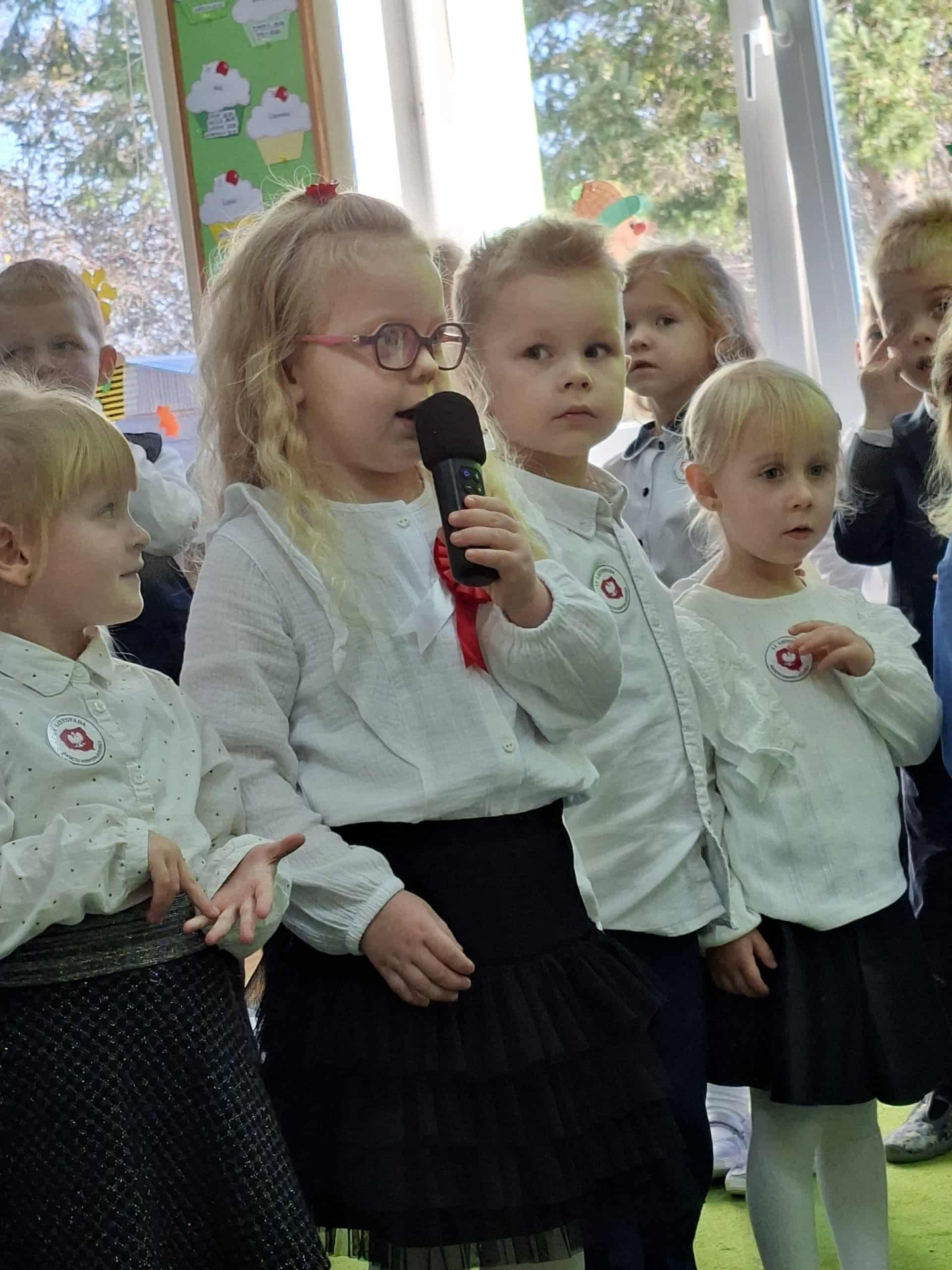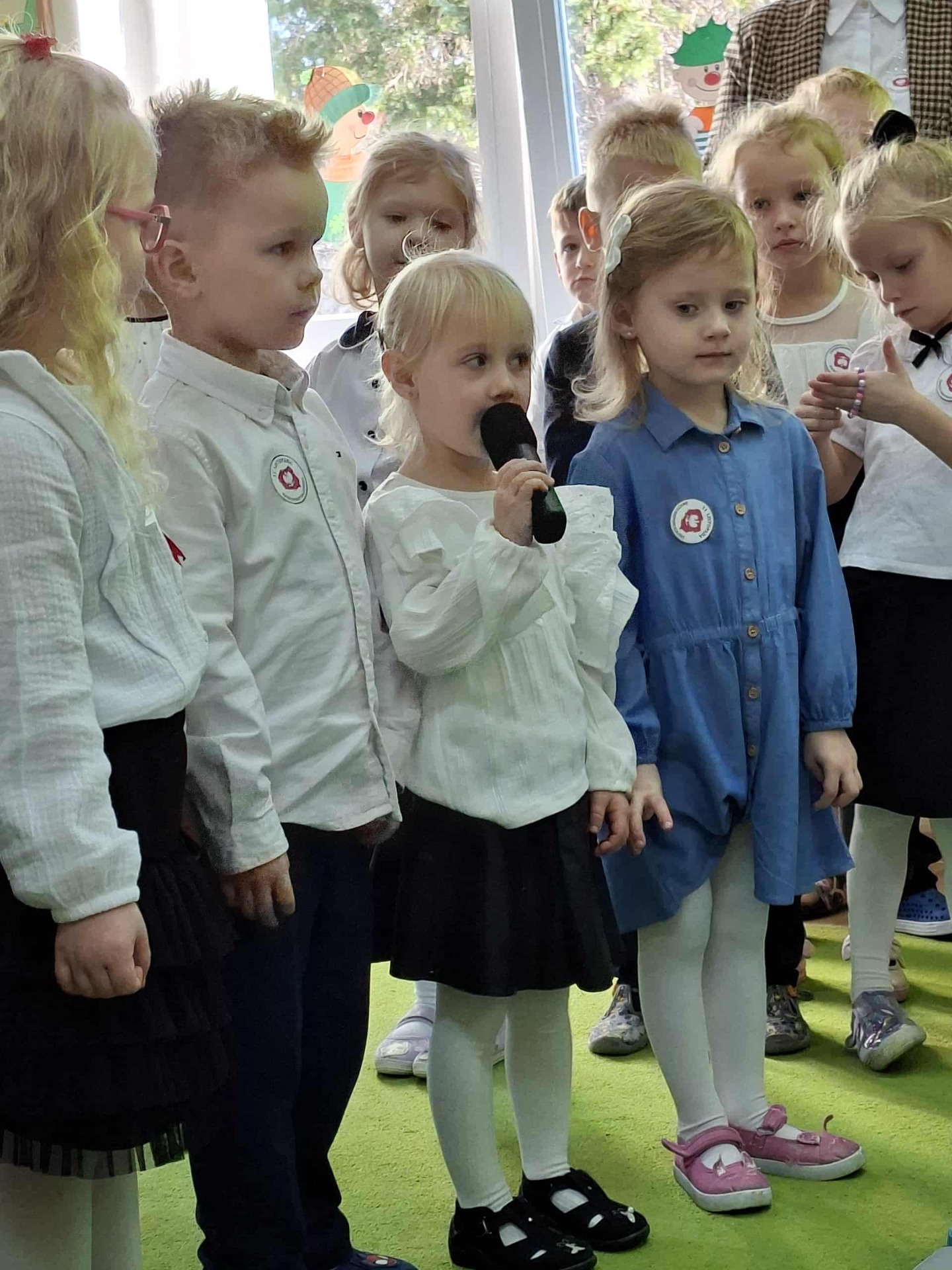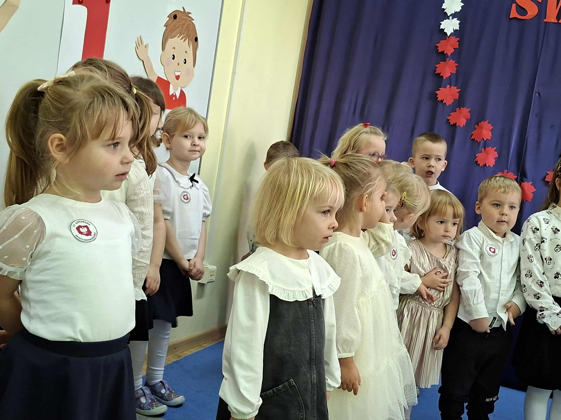 Przedszkolaki recytowały wiersze, śpiewały pieśni o tematyce patriotycznej "Szara Piechota", "Bo ja jestem Polak Mały", "Polska - moje miejsce na ziemi". W ramach akcji MEN Szkoła do hymnu cała społeczność przedszkolna z gośćmi odśpiewała hymn narodowy "Mazurek Dąbrowskiego" pamiętając przy tym o zachowaniu należytej postawy. Podniosłe wydarzenie zamknął taniec starszaków do pieśni" Przybyli ułani pod okienko".