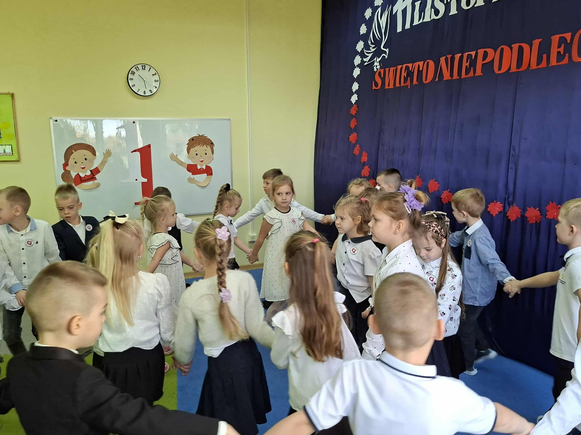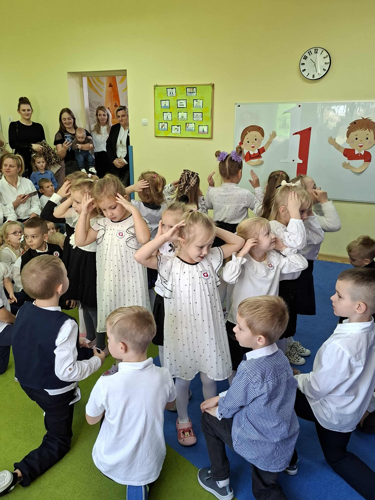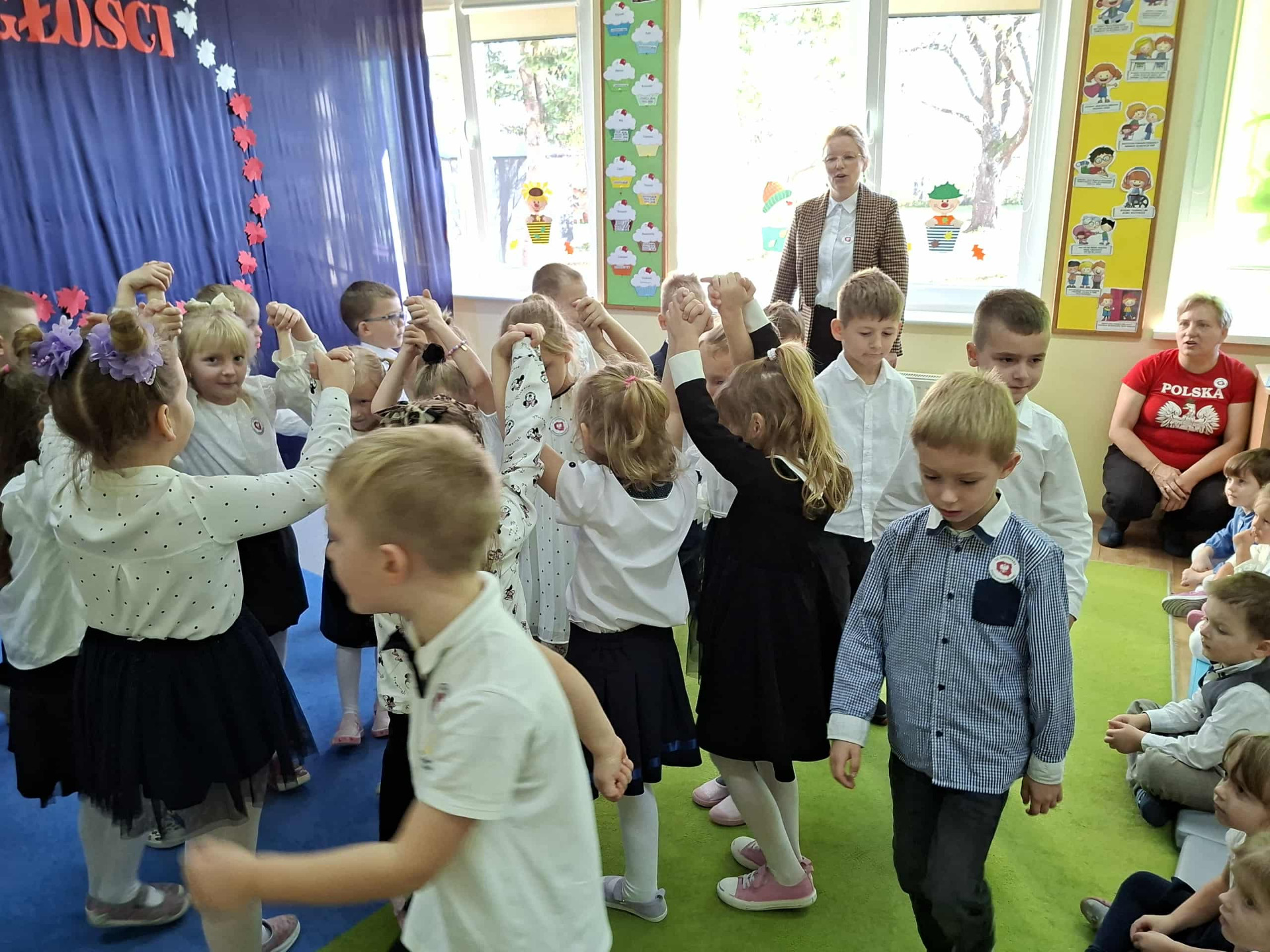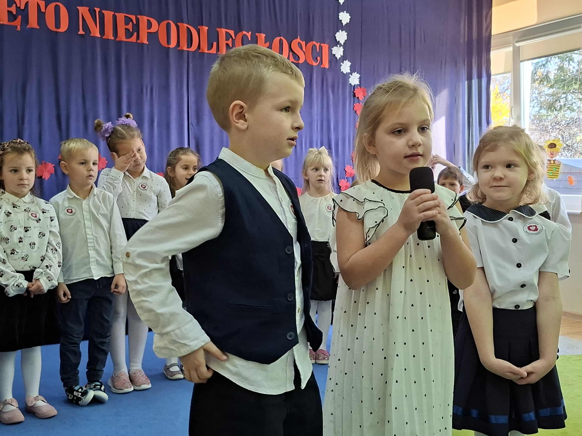 Przedszkolaki recytowały wiersze, śpiewały pieśni o tematyce patriotycznej "Szara Piechota", "Bo ja jestem Polak Mały", "Polska - moje miejsce na ziemi". W ramach akcji MEN Szkoła do hymnu cała społeczność przedszkolna z gośćmi odśpiewała hymn narodowy "Mazurek Dąbrowskiego" pamiętając przy tym o zachowaniu należytej postawy. Podniosłe wydarzenie zamknął taniec starszaków do pieśni" Przybyli ułani pod okienko".