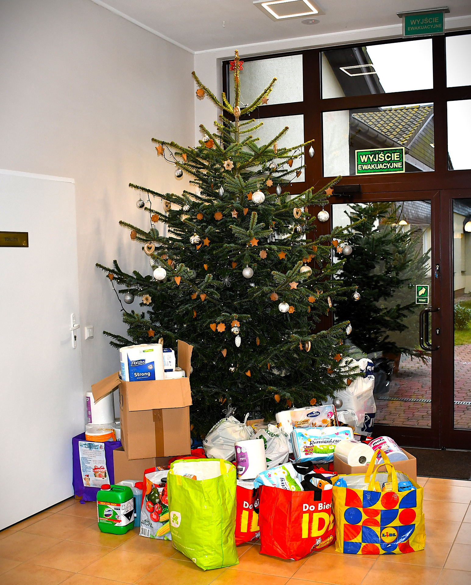 Przekazane dary zostały ułożone pod choinką, wnosząc świąteczną atmosferę oraz wyraz wsparcia i solidarności z osobami potrzebującymi szczególnej troski.