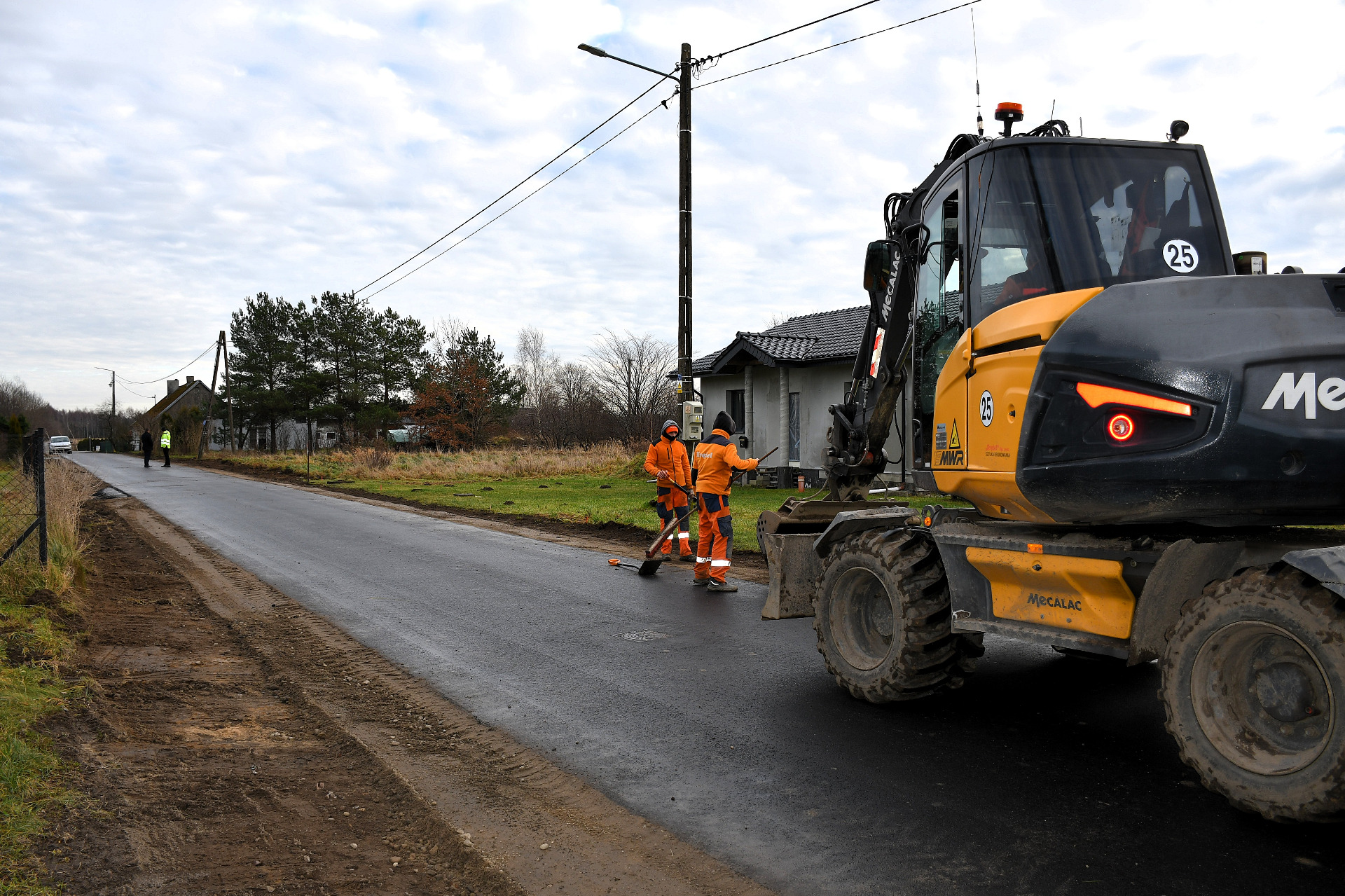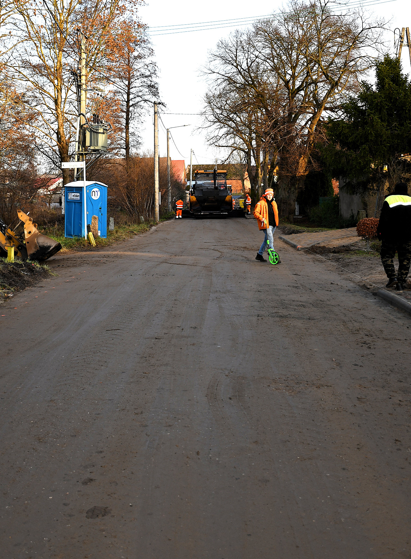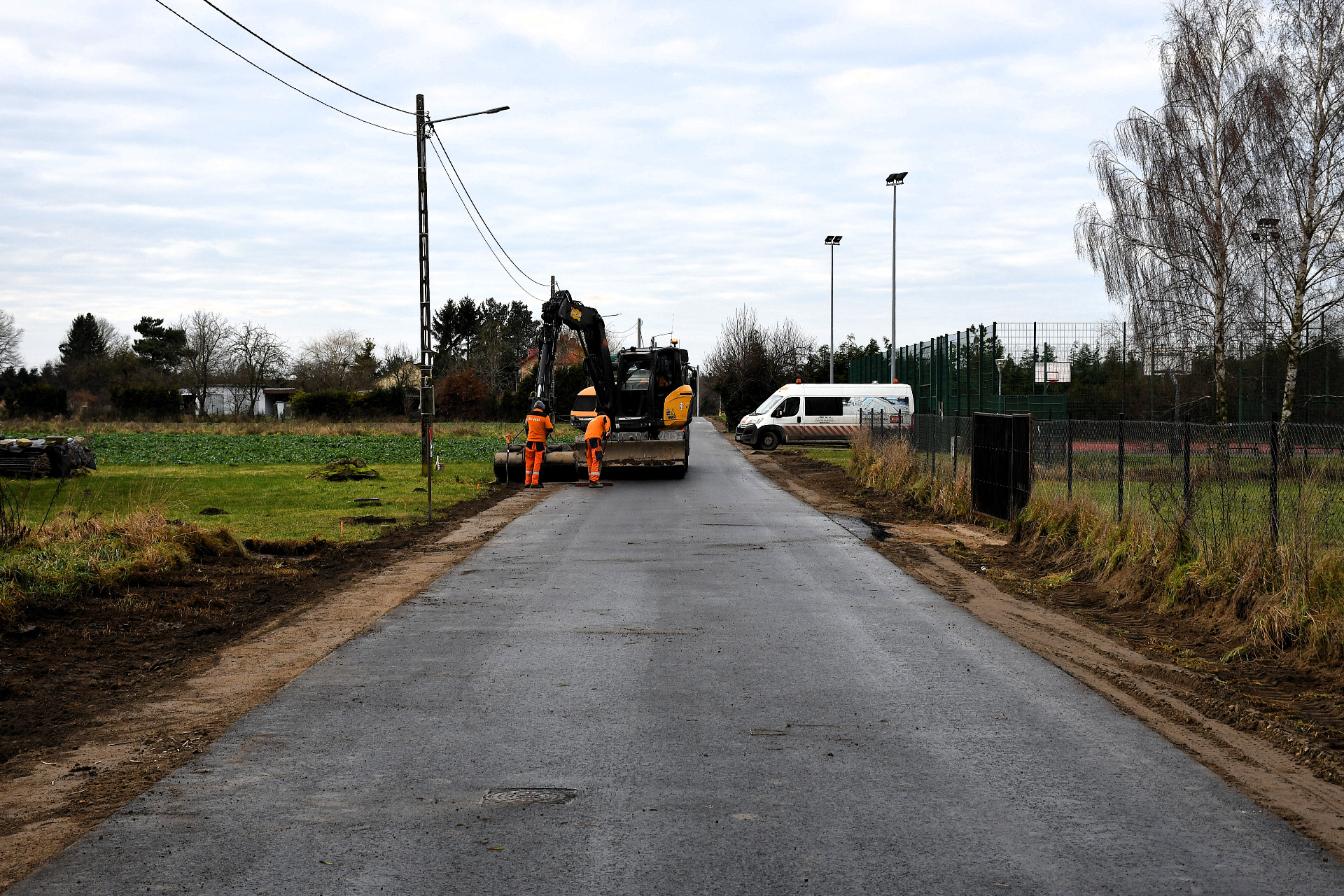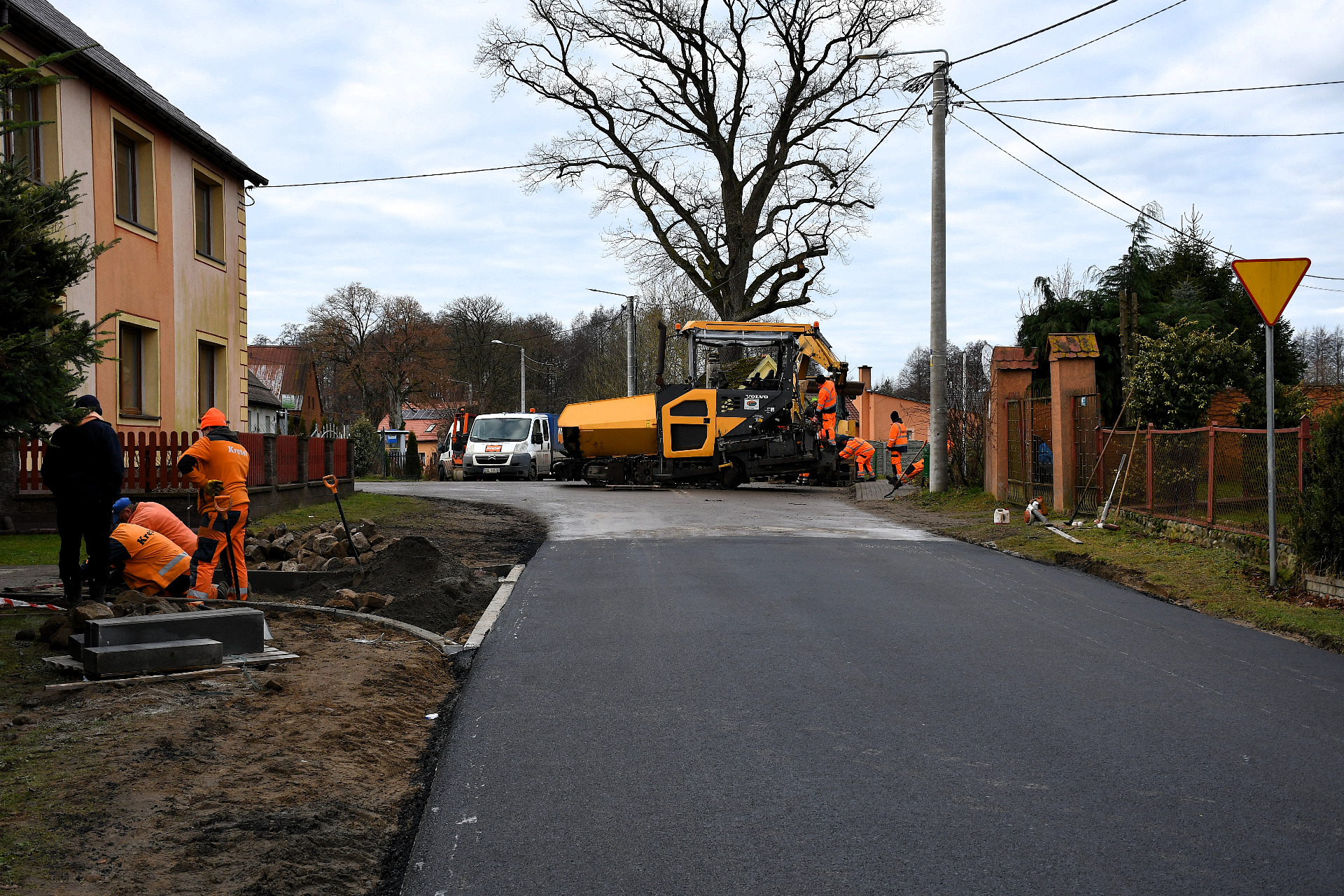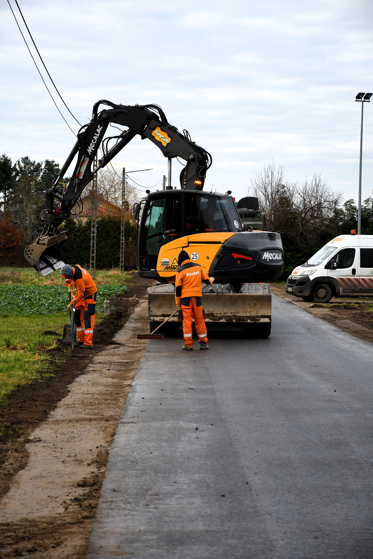 Druga inwestycja to przebudowa drogi gminnej nr 170022Z na działce nr 262, o długości 321 metrów. W ramach prac usuwana jest stara nawierzchnia z bruku i kruszywa, wykonywana jest nowa konstrukcja drogi z asfaltu, a na zjazdach oraz progach zwalniających układana jest kostka brukowa z kamienia, co podnosi zarówno trwałość, jak i estetykę tej części miejscowości.