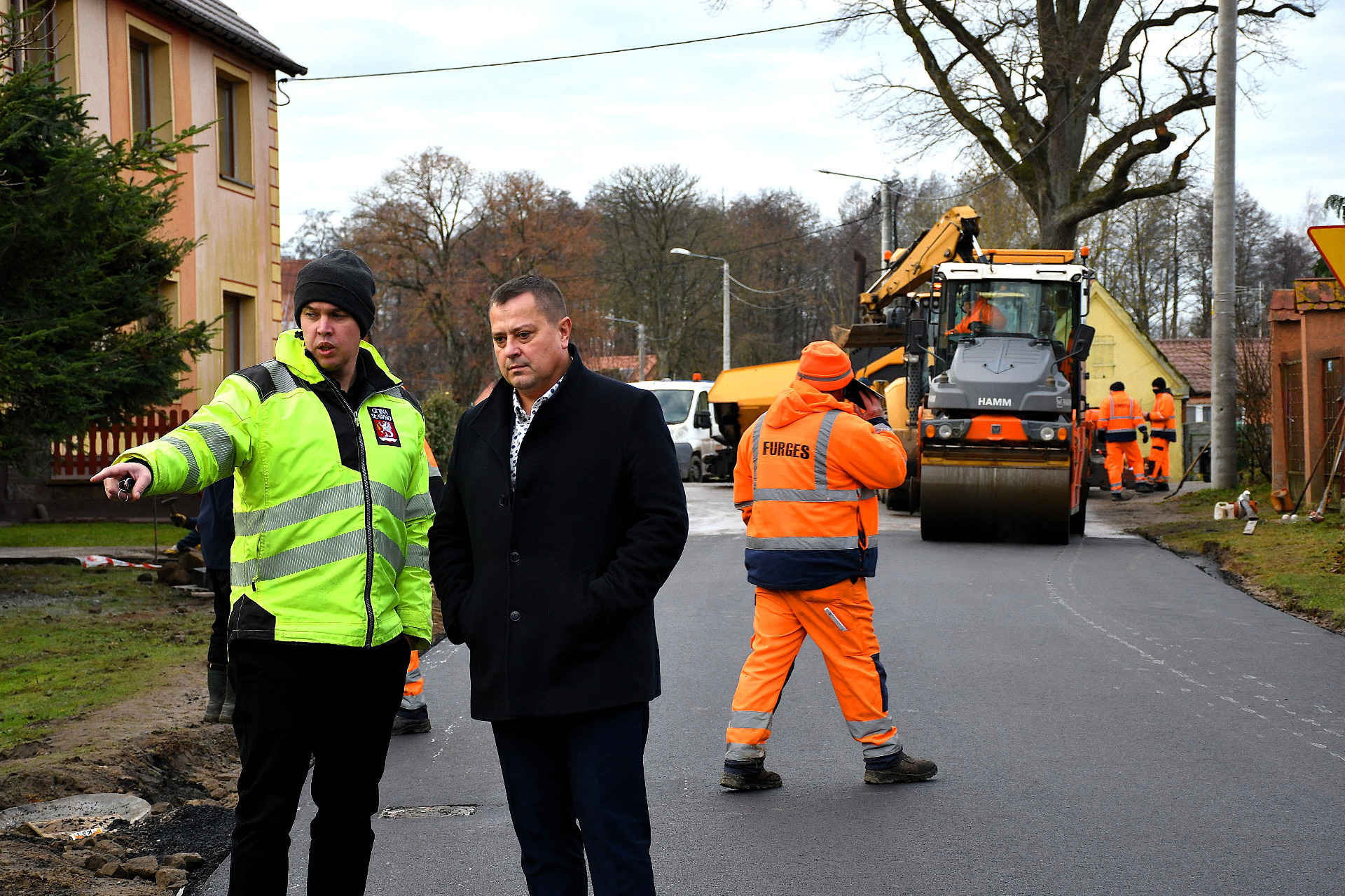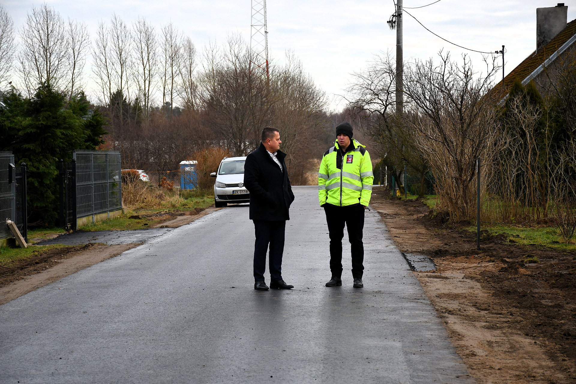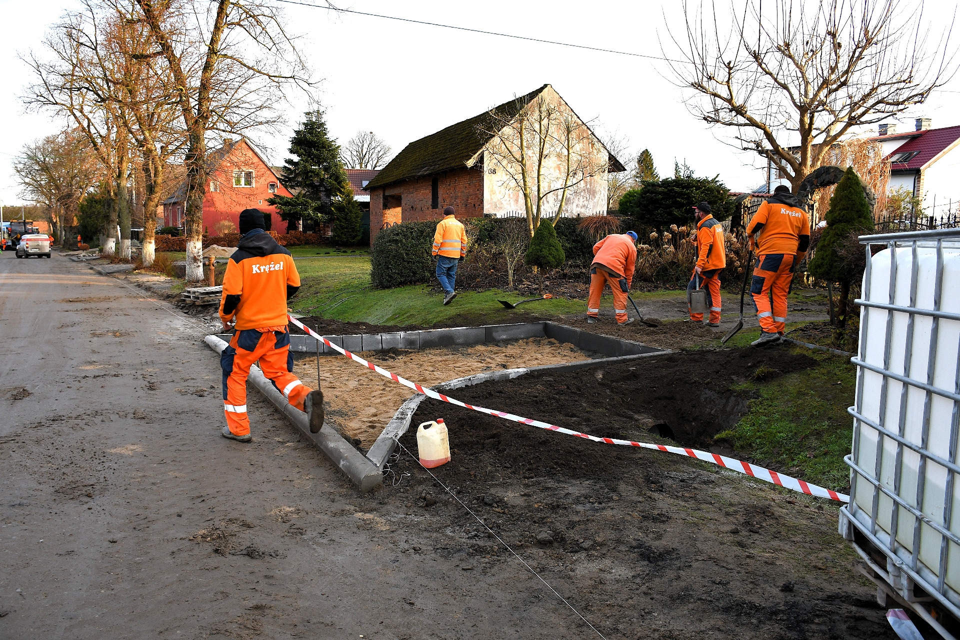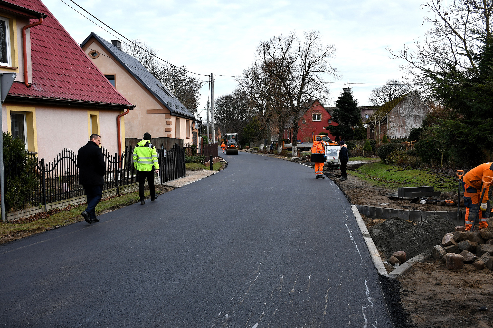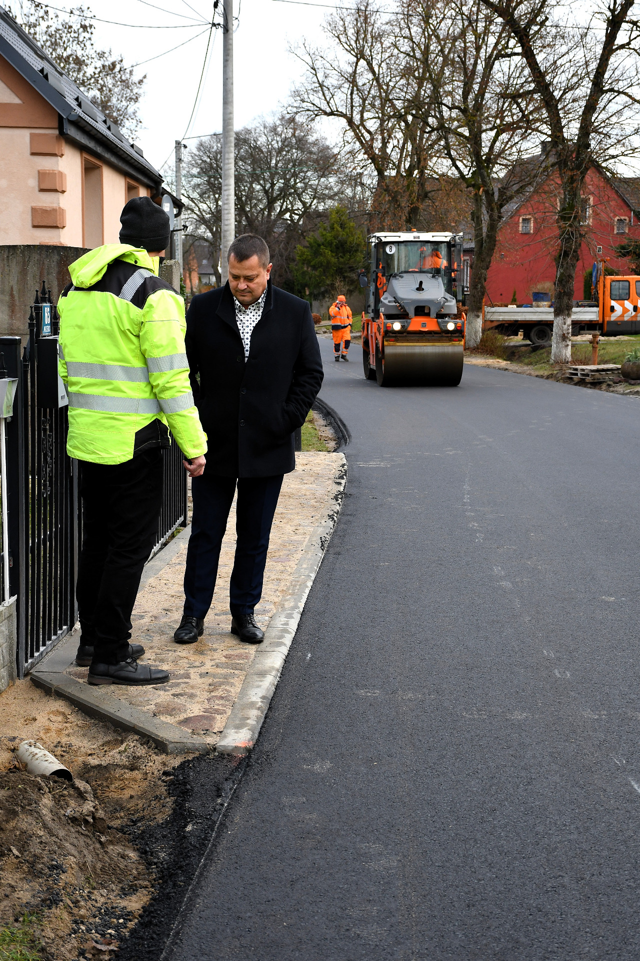 Druga inwestycja to przebudowa drogi gminnej nr 170022Z na działce nr 262, o długości 321 metrów. W ramach prac usuwana jest stara nawierzchnia z bruku i kruszywa, wykonywana jest nowa konstrukcja drogi z asfaltu, a na zjazdach oraz progach zwalniających układana jest kostka brukowa z kamienia, co podnosi zarówno trwałość, jak i estetykę tej części miejscowości.