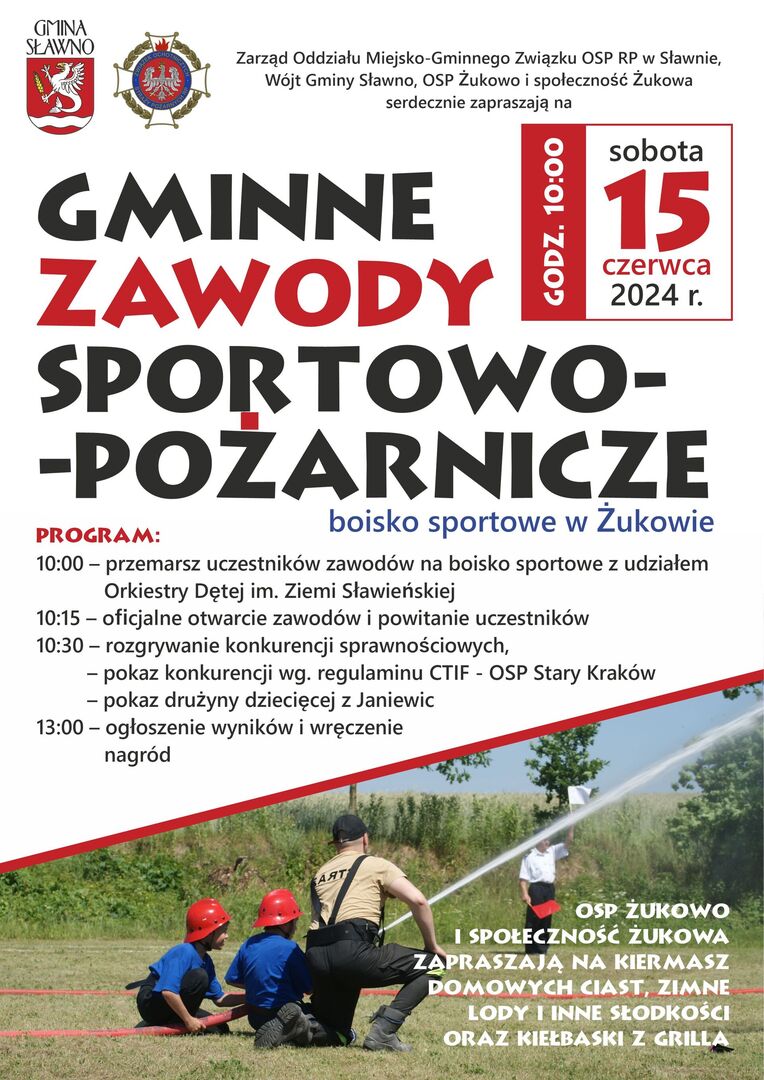 Zarząd Oddziału Miejsko-Gminnego Związku OSP RP w Sławnie, Wójt Gminy Sławno, OSP Żukowo i społeczność Żukowa serdecznie zapraszają na Gminne Zawody Sportowo-Pożarnicze, które odbędą się w dniu 15 czerwca 2024 r. (sobota) na boisku sportowym w Żukowie.