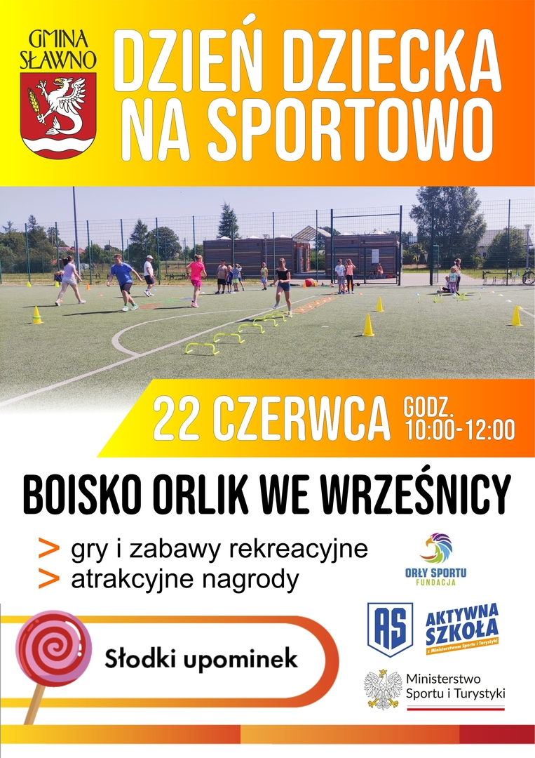 Wójt Gminy Sławno wraz z Animatorami kompleksu boisk "Orlik 2012" we Wrześnicy serdecznie zapraszają wszystkie dzieci i młodzież wraz z rodzicami, dziadkami i opiekunami na boisko Orlik we Wrześnicy na Dzień Dziecka na sportowo.