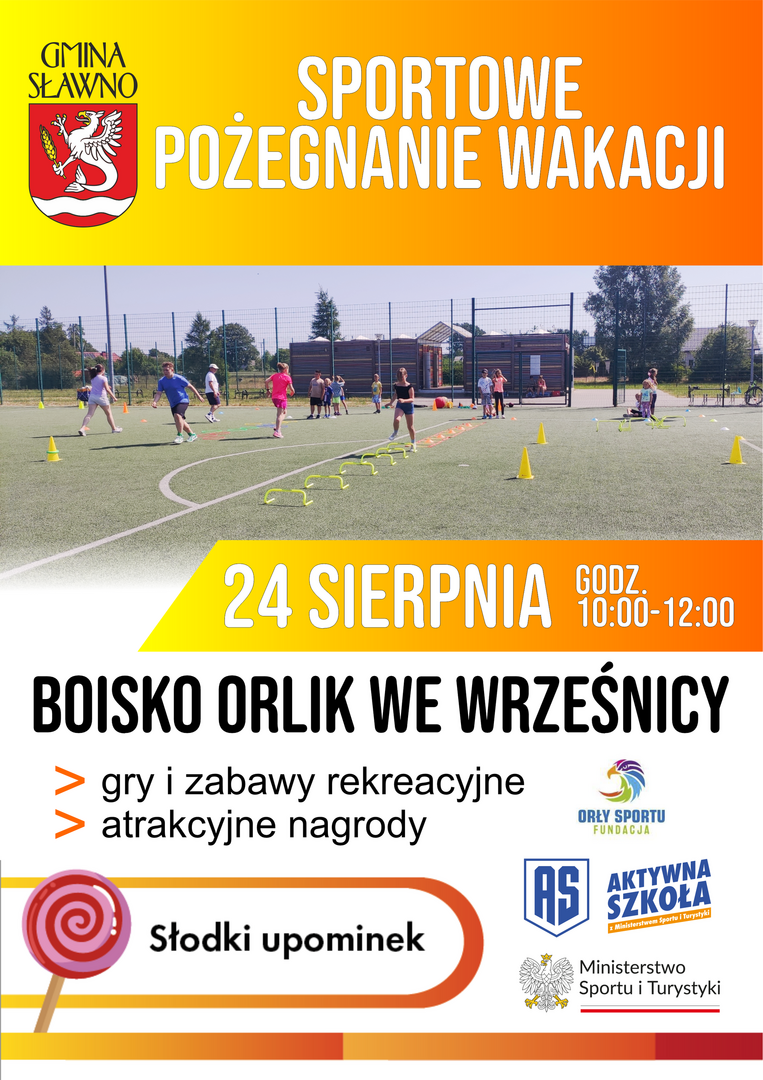 Wójt Gminy Sławno wraz z Animatorami kompleksu boisk "Orlik 2012" we Wrześnicy serdecznie zapraszają wszystkie dzieci i młodzież wraz z rodzicami, dziadkami i opiekunami na boisko Orlik we Wrześnicy na Sportowe Pożegnanie Wakacji.