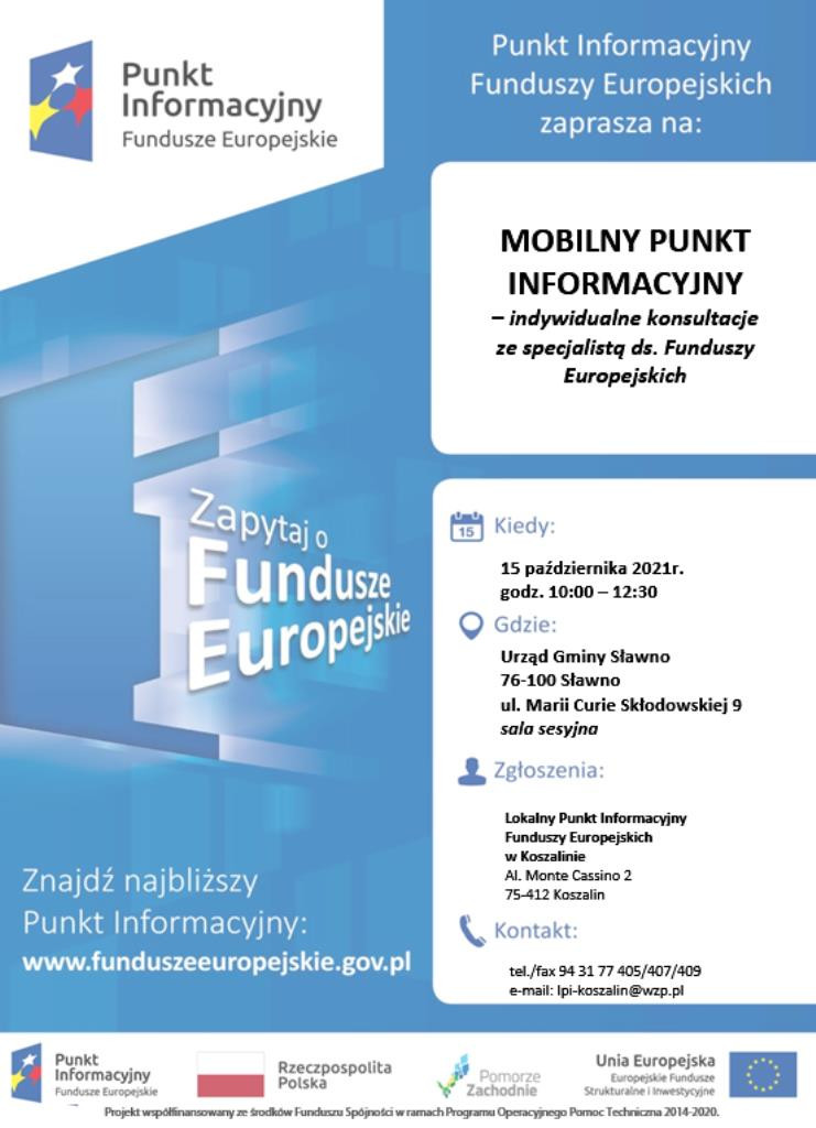 Lokalny Punkt Informacyjny Funduszy Europejskich w Koszalinie wraz z Urzędem Gminy w Sławnie, serdecznie zapraszają na indywidualne spotkanie – rozmowę ze specjalistą ds. funduszy europejskich w ramach Mobilnego Punktu Informacyjnego Funduszy Europejskich, podczas którego będzie można otrzymać informację m.in. o: