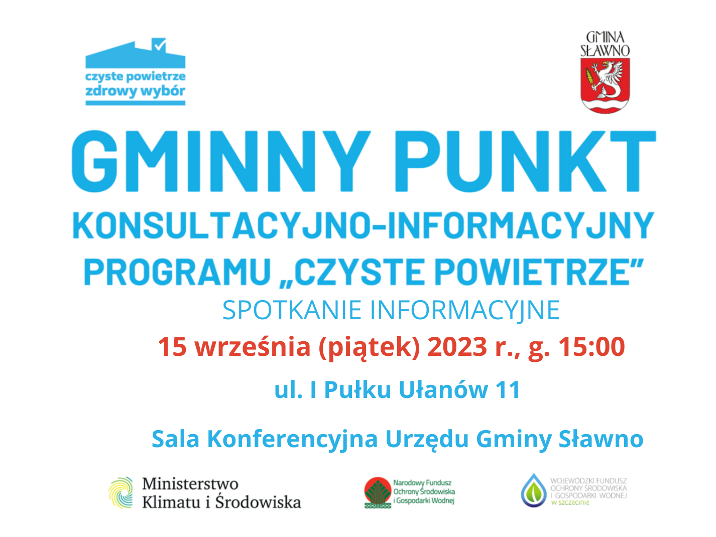 Zapraszamy wszystkich mieszkańców Gminy Sławno zainteresowanych dofinansowaniem w ramach Programu "Czyste Powietrze" na spotkanie informacyjne w dniu 15 września (piątek) 2023 r. o godzinie 15:00.